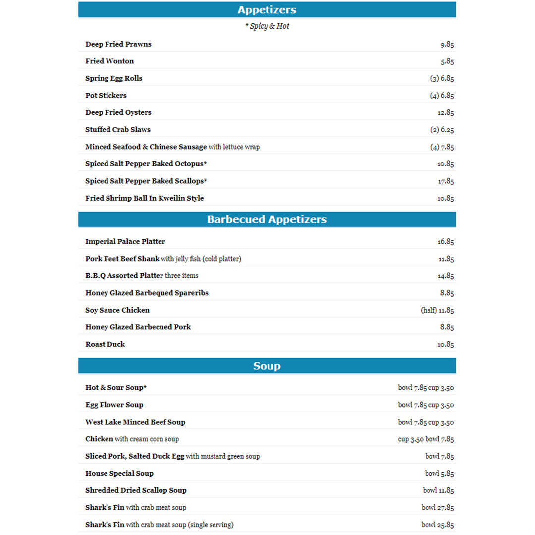 For general comments or questions about catering needs, reservations, ordering, menu items etc., please call Imperial Palace directly during business hours. (415) 956-9888